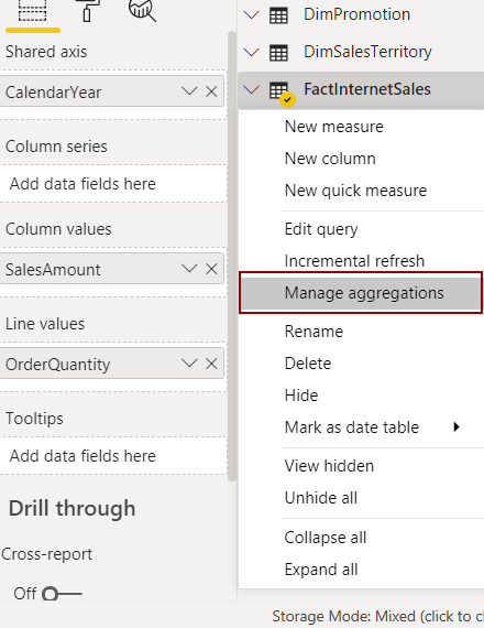 Next up, for setting up the aggregations table we need to configure it by right-clicking on the table and select the option Manage aggregations.