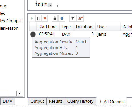 Respectively, two queries one with the aggregation hit and another that went through DirectQuery technology to the database.