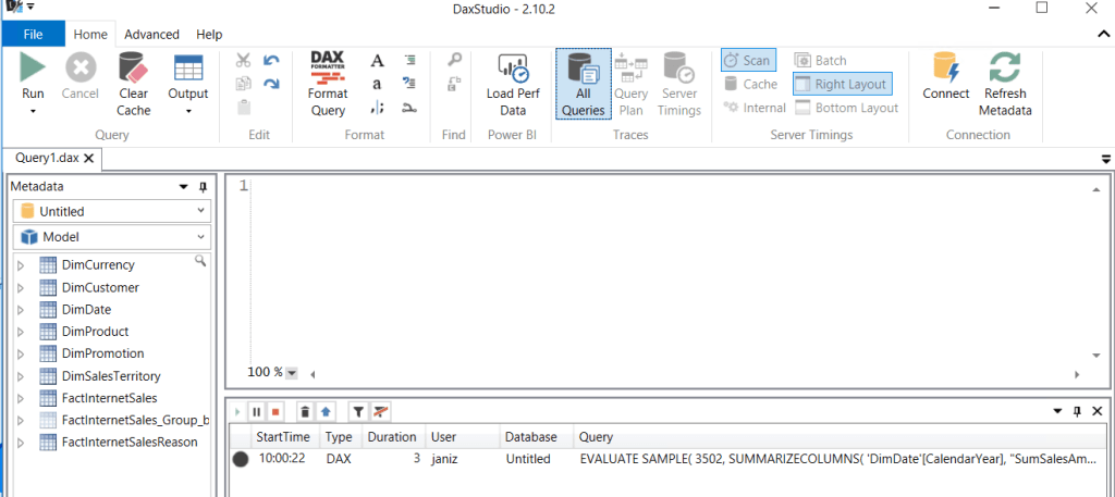 Then, open DAX Studio (if you don’t yet have it, now is the time to install) and go to the Report view to create a visual, say SalesAmount by Year. Oh, opening DAX Studio you have to connect to your model and enable listening to All Queries.