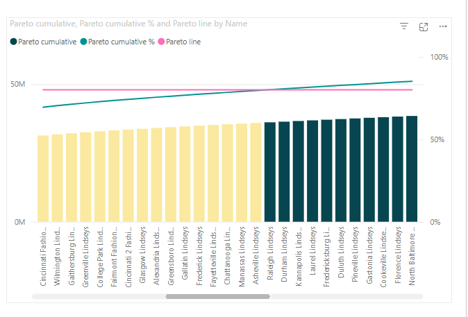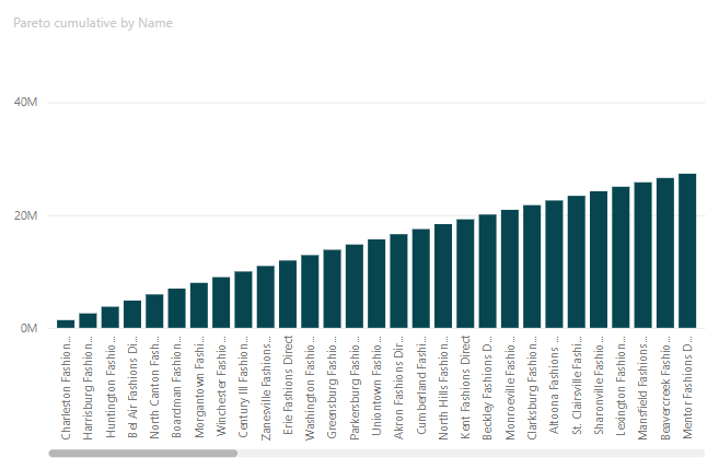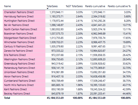 Additionally, what could be added is the Pareto%, which shouldn’t be too hard. We just divide the cumulative Pareto value by the Total sales for all the Pareto dimensions, in this case Total sales for all the Stores, and voila.